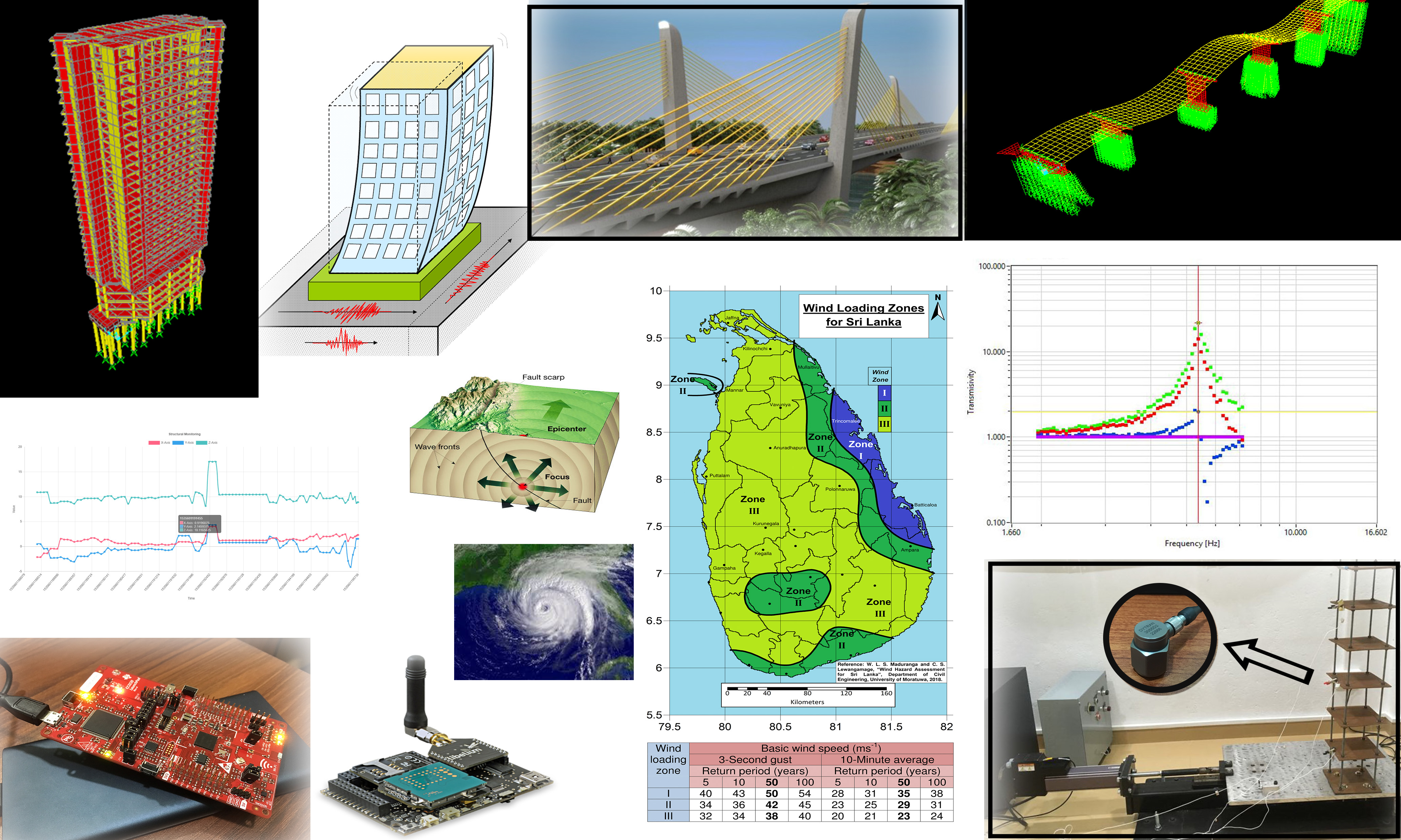 Our primary research focus is on dynamics of structures and structural health monitoring. We investigate the dynamic behavior of structures in both in-situ and laboratory settings. We monitor the health of existing structures using wireless smart sensors. Furthermore, research is done in detecting and estimating damage using experimental modal data at laboratory setting using scaled down building models coupled with shake table. We also review wind maps from time to time in order to maintain the standards and ensure the relevance to Sri Lankan context. Currently our focus is on developing and establishing wireless sensor networks at large scale civil engineering structures and predicting the behavior of the structures and maintaining them as a living laboratory. Working together with an interdisciplinary team consisting of professionals form structural engineering, electronics and telecommunication engineering, integrated circuit engineering, we do cutting edge research which aims to bridge the gap between the performance of real structures and the results from laboratory tests done on scale models.